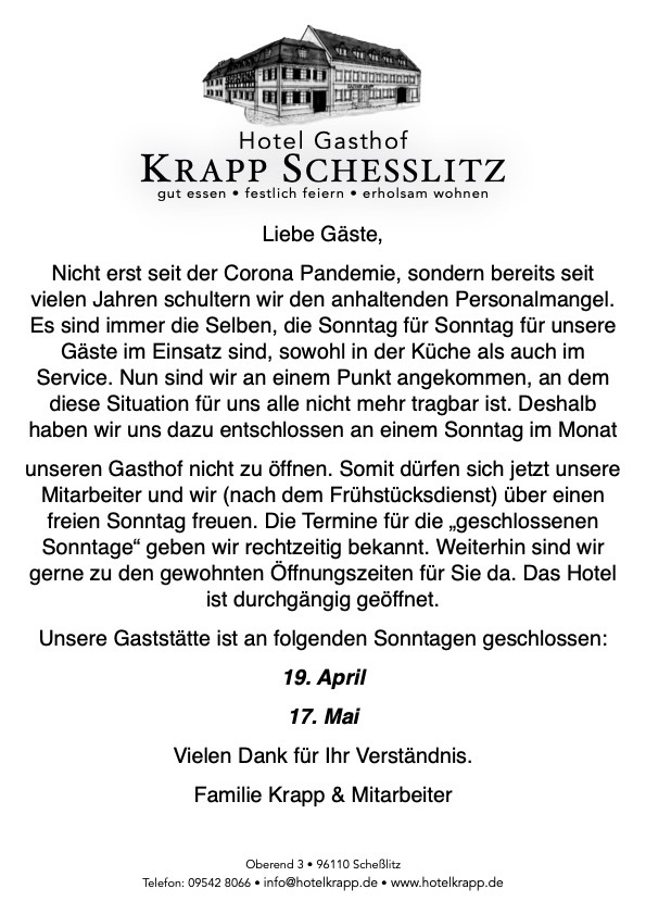 Unsere Gaststätte ist von Donnerstag, 16. April bis einschließlich Donnerstag, 23. April geschlossen. Das Hotel ist durchgehend geöffnet.