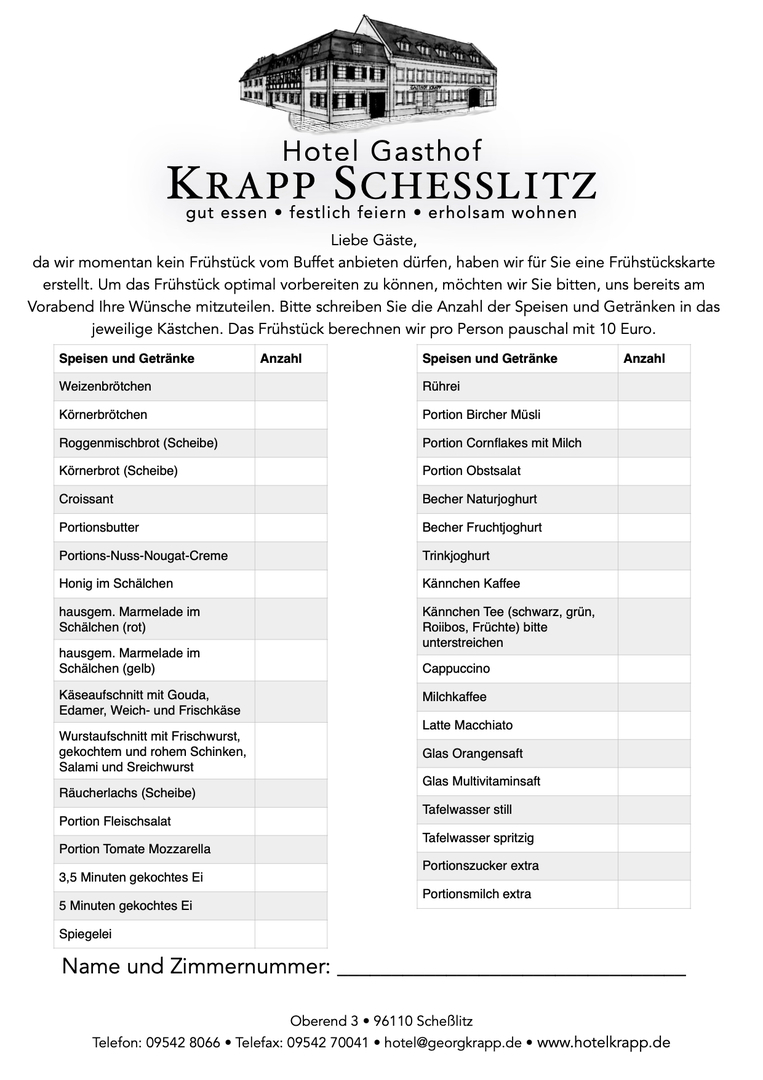 Um den aktuell geltenden Hygienerichtlininien und -standards gerecht zu werden, werden wir unser Frühstück vorübergehend nur à la carte anbieten. Hierfür haben wir eine Karte zum Ankreuzen erstellt. Gerne können Sie sich schon einmal Appetit holen und wenn Sie möchten, dürfen Sie die ausgefüllte Karte zu Ihrem nächsten Besuch gleich mitbringen!